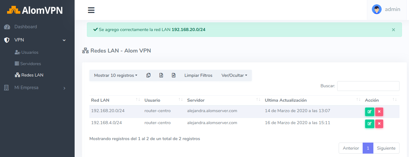 Damos click en guardar y regresaremos a la lista de Redes LAN donde observaremos que se ha creado con éxito.
